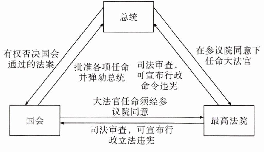 分权与制衡(三权分立)。在联邦体制之下,美国总统掌握行政权、国会掌握立法权、最高法院掌握司法权,三个部分及其相关机构既各司其职,又相互制衡。如国会有权弹劾总统、批准总统的各项任命,最高法院通过司法审查,可宣布总统的行政命令违宪,等等。
