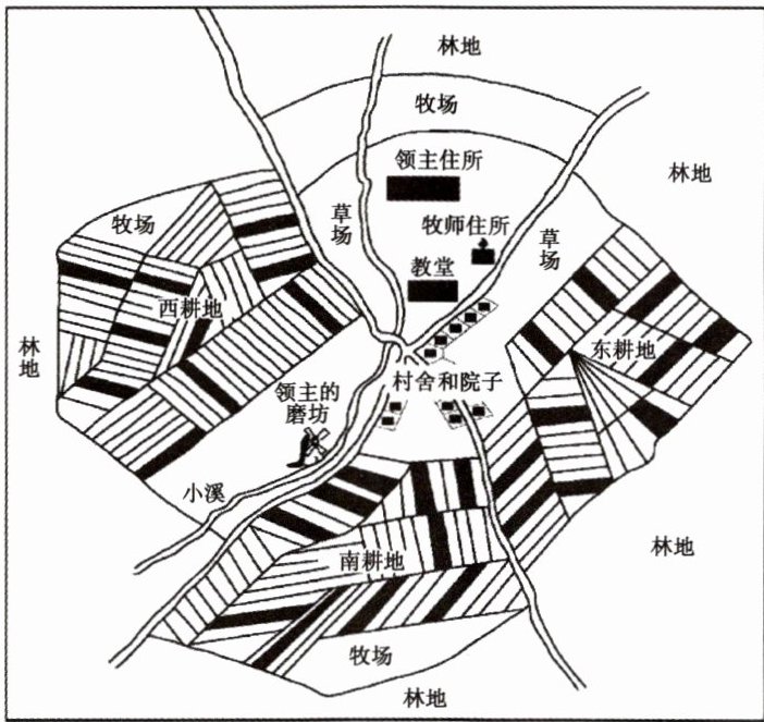 (1)庄园里的耕地分布在住所周围,包括领主的“自领地”和佃户的份地;周围的林地、牧场、草场等为“公用地”,全体佃户均可使用;使用领主的磨坊需要缴纳使用费;教堂位于领主和村民居住地之间,为领主和佃户的公共场所。