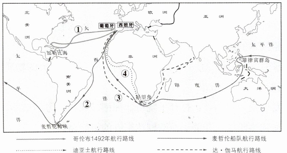 3. 下图展现了人类在 15 世纪末到 16 世纪初对地球的探索过程,其中最能证明“地圆说”为科学真理的航海路线是( )