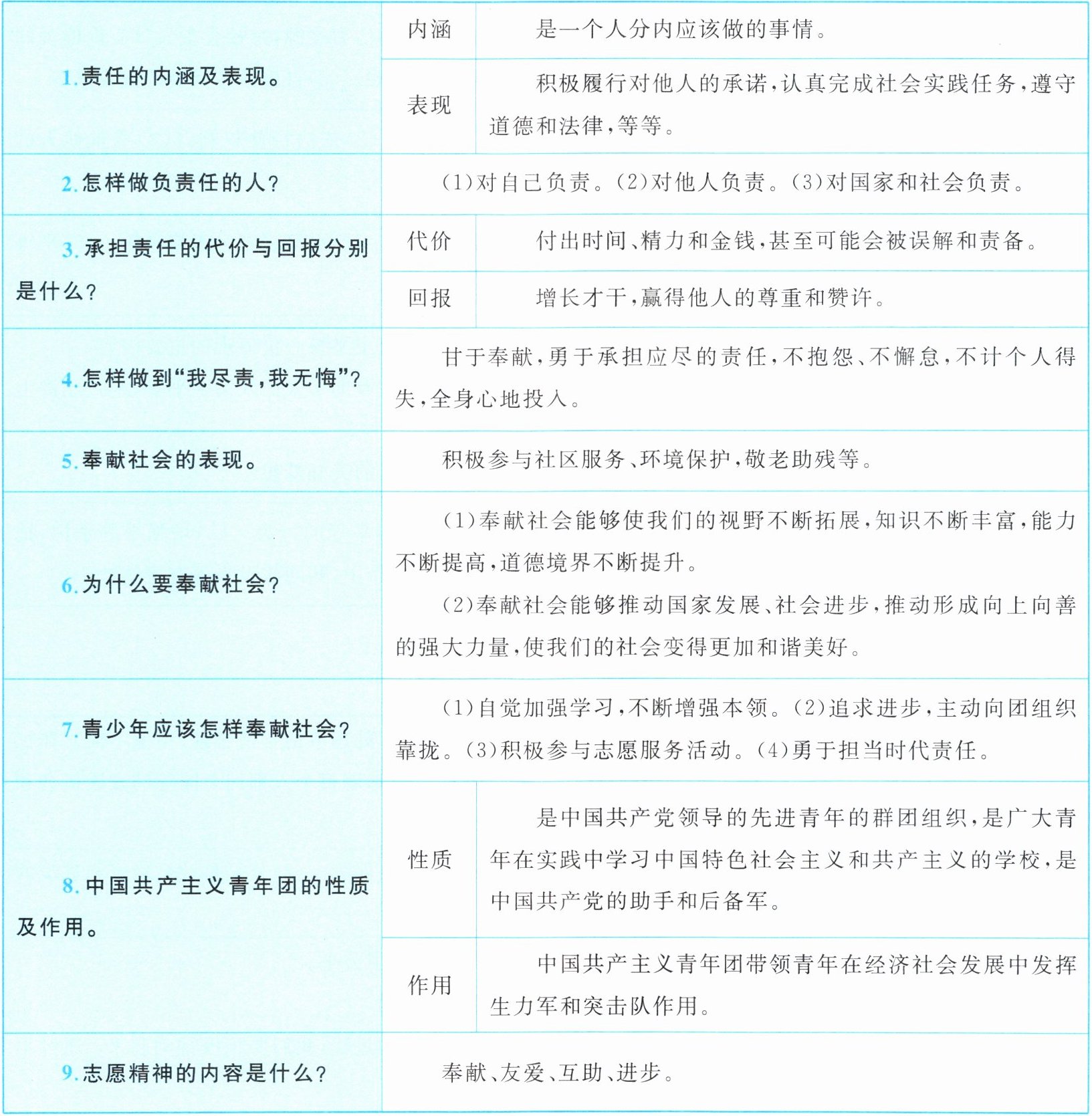 |7|青少年应该怎样奉献社会?|(1)自觉加强学习,不断增强本领。(2)追求进步,主动向团组织靠拢。(3)积极参与志愿服务活动。(4)勇于担当时代责任。|