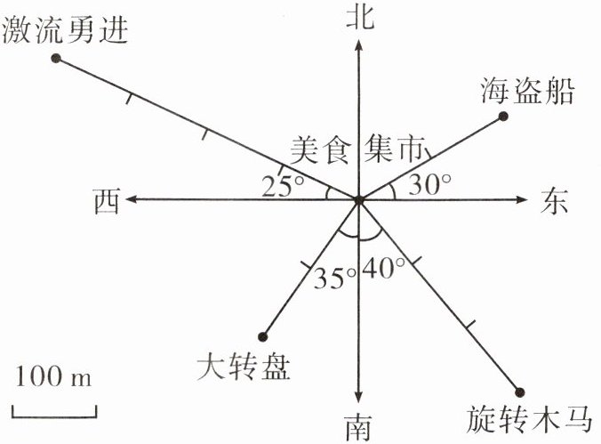 (1)激流勇进在美食集市( )偏( )( )°方向上,距离是( )m。