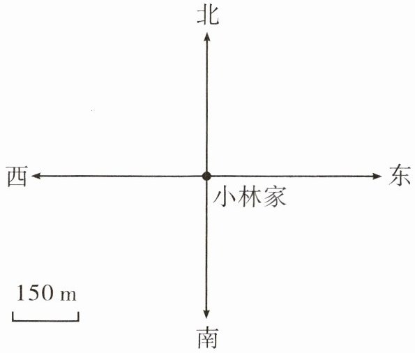 1.以小林家为原点,画一条水平向右(正东方向)的线段,长度为2个单位(每个单位代表150m,因此总长度为300m),终点标记为超市。