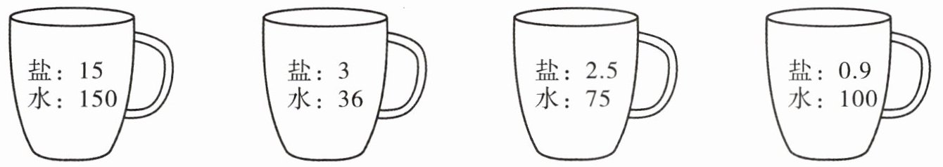 1. 写出各杯盐水中盐与水的最简单的整数比。(单位:g)