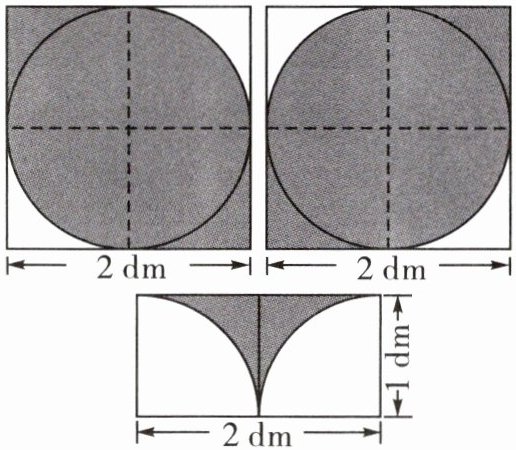 3. 小红在做一幅贴画作品,她用圆规和三角尺在纸上画出下面的图形,再把涂色部分剪下来做小动物的眼睛和嘴色。小红剪下部分的面积一共是多少平方分米?