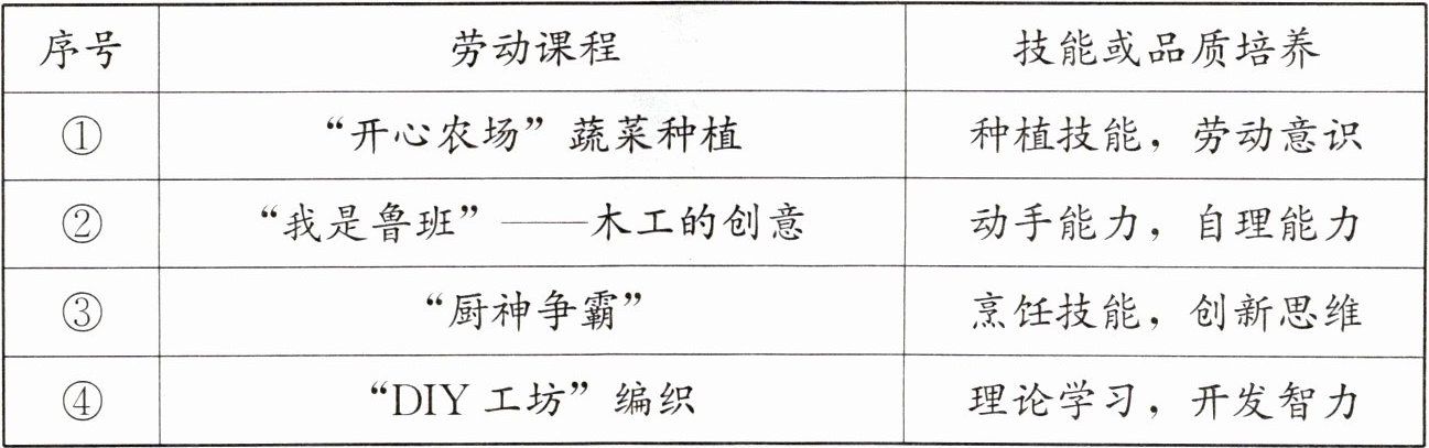 3. “劳”以启智,“动”以润心。某中学开设了一系列丰富多彩的劳动课程,将劳动教育与日常教学紧密结合,培养学生的劳动意识、劳动习惯和劳动能力。下表中各劳动课程与其培养的技能或品质对应正确的是( )
