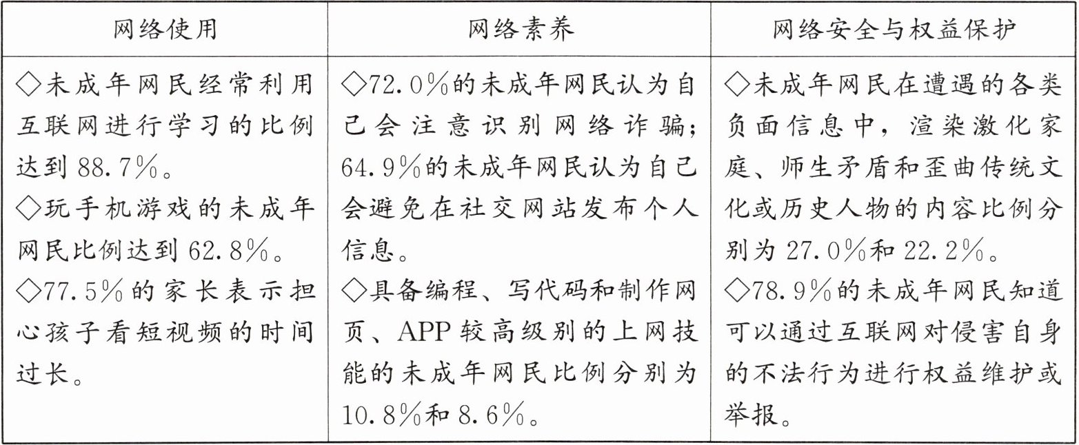 (1)依据所学知识和材料中的数据,请你对未成年网民上网情况进行总结。
