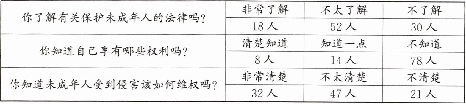 材料 某校八年级(1)班的同学们面向八年级学生开展了“中学生法治意识”问卷调查。下表是问卷调查的部分内容及结果: