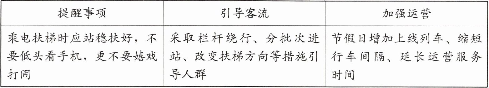 |乘电扶梯时应站稳扶好,不要低头看手机,更不要嬉戏打闹|采取栏杆绕行、分批次进站、改变扶梯方向等措施引导人群|节假日增加上线列车、缩短行车间隔、延长运营服务时间|