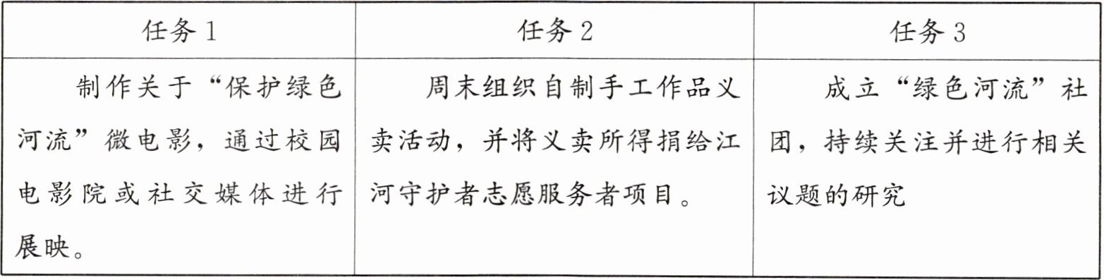 |制作关于“保护绿色河流”微电影,通过校园电影院或社交媒体进行展映。|周末组织自制手工作品义卖活动,并将义卖所得捐给江河守护者志愿服务者项目。|成立“绿色河流”社团,持续关注并进行相关议题的研究|