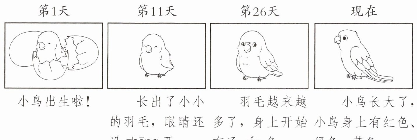 文字描述:小鸟长大了,小鸟身上有红色、绿色、黄色。