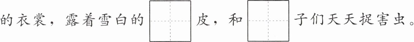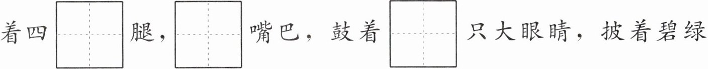 1. 小蝌蚪甩着长长的尾巴,四处找妈妈。他们的妈妈长着四$\begin{array}{|c|}\hline tiáo \\ \hline \end{array}\\ \hline $腿,$\begin{array}{|c|}\hline kuān \\ \hline \end{array}\\ \hline $嘴巴,鼓着$\begin{array}{|c|}\hline liǎng \\ \hline \end{array}\\ \hline $只大眼睛,披着碧绿的衣裳,露着雪白的$\begin{array}{|c|}\hline dù \\ \hline \end{array}\\ \hline $皮,和$\begin{array}{|c|}\hline hái \\ \hline \end{array}\\ \hline $子们天天捉害虫。