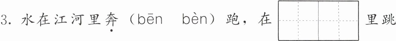 3. 水在江河里奔(bēn bèn)跑,在$\begin{array}{|c|c|}\hline hǎi & yáng \\ \hline \end{array}\\ \hline $里跳舞,唱歌,开大会。