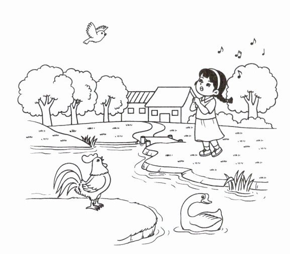 一(只)公鸡站岸边 一(只)白鹅水里游 一(只)小鸟空中飞 一(个)女孩唱歌谣 两(座)房子 一(条)小路 一(片)草坪 一(排)绿树