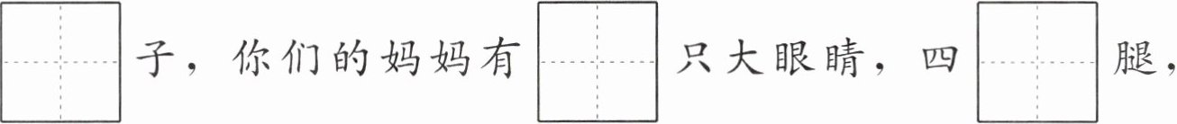 hái 子,你们的妈妈有 liǎng 只大眼睛,四 tiáo 腿,kuān 嘴巴。你们到 nà 边去找吧!