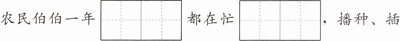 农民伯伯一年$\begin{array}{|c|c|}\hline sì & jì \\\hline\end{array}\\\hline 都在忙\begin{array}{|c|c|}\hline nóng & shì \\\hline\end{array}\\\hline $,播种、插秧、施$\begin{array}{|c|}\hline féi \\\hline\end{array}\\\hline $、收割、晒$\begin{array}{|c|}\hline gǔ \\\hline\end{array}\\\hline $……他们很$\begin{array}{|c|c|}\hline xīn & kǔ \\\hline\end{array}\\\hline $。