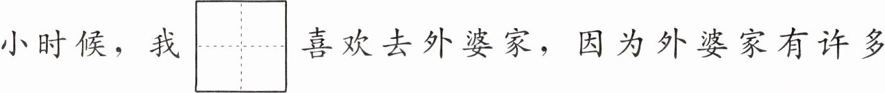 小时候,我$\overset{zǒng}{□}$喜欢去外婆家,因为外婆家有许多$\overset{bǎo}{□}$贝,有活泼爱唱$\overset{qǔ}{□}$儿的山雀,有$\overset{xiāng}{□}$气扑鼻的野花,还有各种叫不出$\overset{míng}{□}$字的小动物。