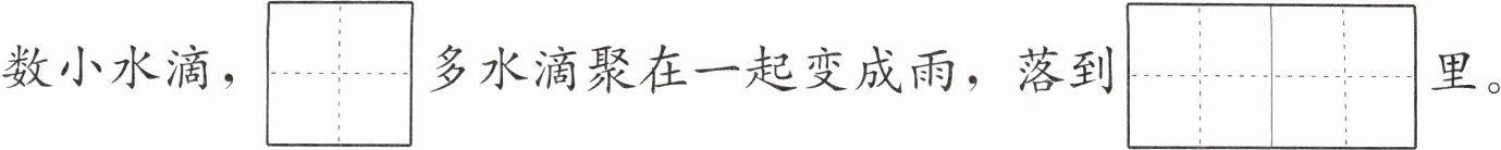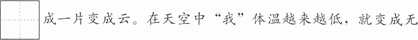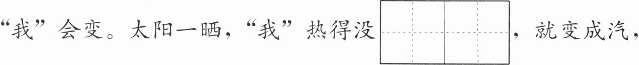 “我”会变。太阳一晒,“我”热得没$\begin{array}{|c|c|}\hline b&à\\\hline n&f\\\hline\end{array}\\\hline $,就变成汽,$\begin{array}{|c|}\hline l\\\hline i\\\hline á\\\hline n\\\hline\end{array}\\\hline $成一片变成云。在天空中“我”体温越来越低,就变成无数小水滴,$\begin{array}{|c|}\hline x\\\hline ǔ\\\hline\end{array}\\\hline $多水滴聚在一起变成雨,落到$\begin{array}{|c|c|}\hline h&ǎ\\\hline ǎ&i\\\hline\end{array}\\\hline $$\begin{array}{|c|c|}\hline y&á\\\hline á&n\\\hline\end{array}\\\hline $里。