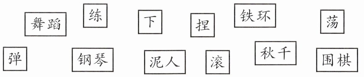 弹—钢琴 荡—秋千 捏—泥人 滚—铁环 下—围棋 练—舞蹈
