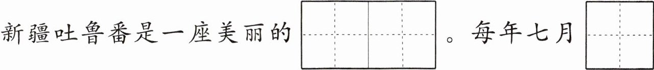 新疆吐鲁番是一座美丽的$\begin{array}{|c|c|}\hline chéng & shì \\\hline\end{array}\\\hline $。每年七月$\begin{array}{|c|}\hline fèn \\\hline\end{array}\\\hline $,葡萄挂满$\begin{array}{|c|}\hline zhī \\\hline\end{array}\\\hline $头。人们把$\begin{array}{|c|}\hline wèi \\\hline\end{array}\\\hline 道甜美的葡萄挂在\begin{array}{|c|}\hline dīng \\\hline\end{array}\\\hline $好的木架上,葡萄的水分从晾房小$\begin{array}{|c|}\hline kǒng \\\hline\end{array}\\\hline $蒸发,就成了葡萄干。