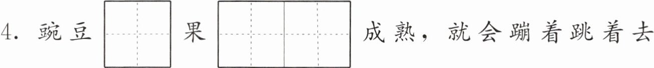 4. 豌豆 $\begin{array}{|c|c|} \hline rú & \\ \hline \end{array}\\ \hline $ 果 $\begin{array}{|c|c|} \hline yǐ & jīng \\ \hline \end{array}\\ \hline $ 成熟,就会蹦着跳着去 $\begin{array}{|c|c|} \hline rèn & shi \\ \hline \end{array}\\ \hline $ $\begin{array}{|c|c|} \hline gèng & dà \\ \hline \end{array}\\ \hline $ 的世界。