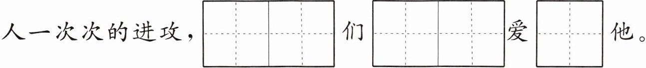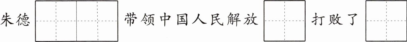 朱德$\overset{\mathrm{t}ó\mathrm{n}\mathrm{g}\mathrm{z}\mathrm{h}ì}{□ □ }带领中国人民解放\overset{\mathrm{j}ū\mathrm{n}}{□ }打败了\overset{\mathrm{d}í}{□ }$人一次次的进攻,$\overset{\mathrm{z}\mathrm{h}à\mathrm{n}\mathrm{s}\mathrm{h}ì}{□ □ }们\overset{\mathrm{f}ē\mathrm{i}\mathrm{c}\mathrm{h}á\mathrm{n}\mathrm{g}}{□ □ }爱\overset{\mathrm{d}à\mathrm{i}}{□ }$他。