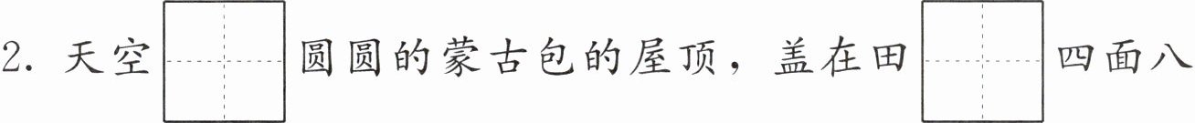 2. 天空$\begin{array}{l}\mathrm{s}ì\\ \hline\end{array}\\ \hline $圆圆的蒙古包的屋顶,盖在田$\begin{array}{l}\mathrm{y}ě\\ \hline\end{array}\\ \hline $四面八方。对应的诗句是:“ , 。”