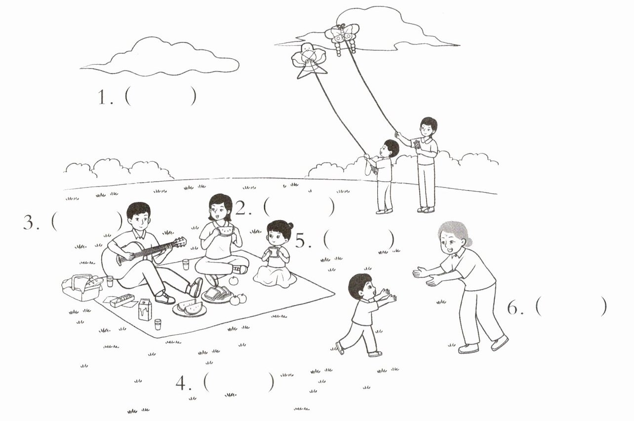 【解析】1. 图中上方是天空,对应④;2. 中间女性是女人,对应⑤;3. 中间男性是男人,对应①;4. 地面是草地,对应③;5. 儿童是小孩,对应②;6. 年长女性是老人,对应⑥。