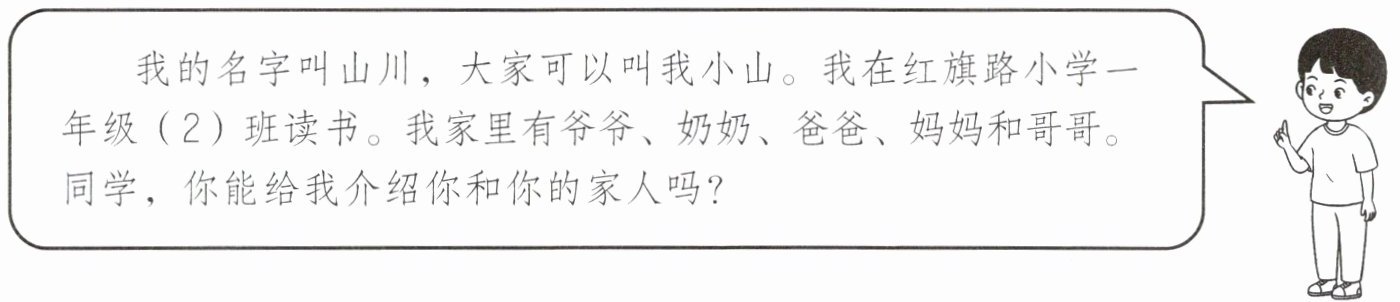 我的名字叫山川,大家可以叫我小山。我在红旗路小学一年级(2)班读书。我家里有爷爷、奶奶、爸爸、妈妈和哥哥。同学,你能给我介绍你和你的家人吗?
