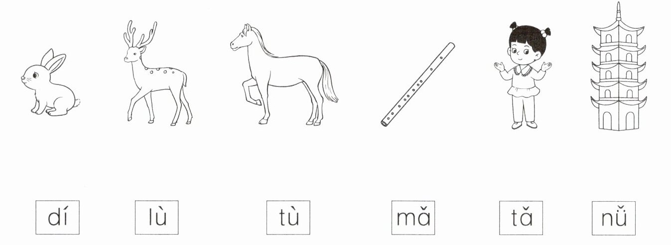 dí连笛子图;lù连鹿图;tù连兔子图;mǎ连马图;tǎ连塔图;nǚ连女孩图。