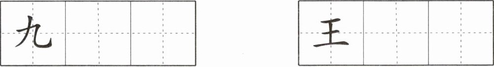九:丿,横折弯钩/横斜钩(在第二个方格中完整写出“九”字);