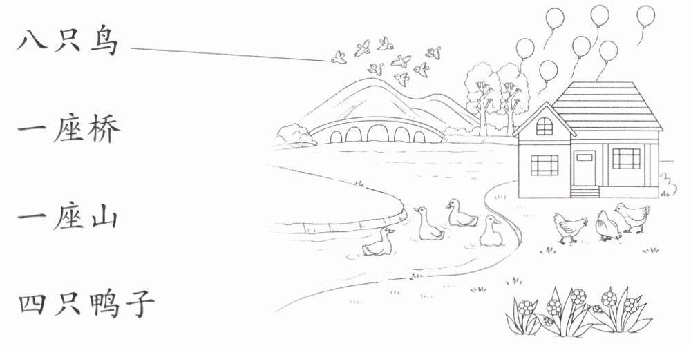 四、读一读,在图里找一找,连一连,再按下面的句式说一说。