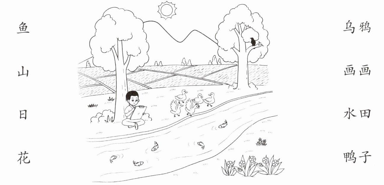 鱼-水里的鱼;山-远处的山;日-天上的太阳;花-路边的花;乌鸦-树上的乌鸦;画画-男孩的动作;水田-远处的田地;鸭子-路边的鸭子。(注:实际作答时应为连线形式,此处以文字说明对应关系)