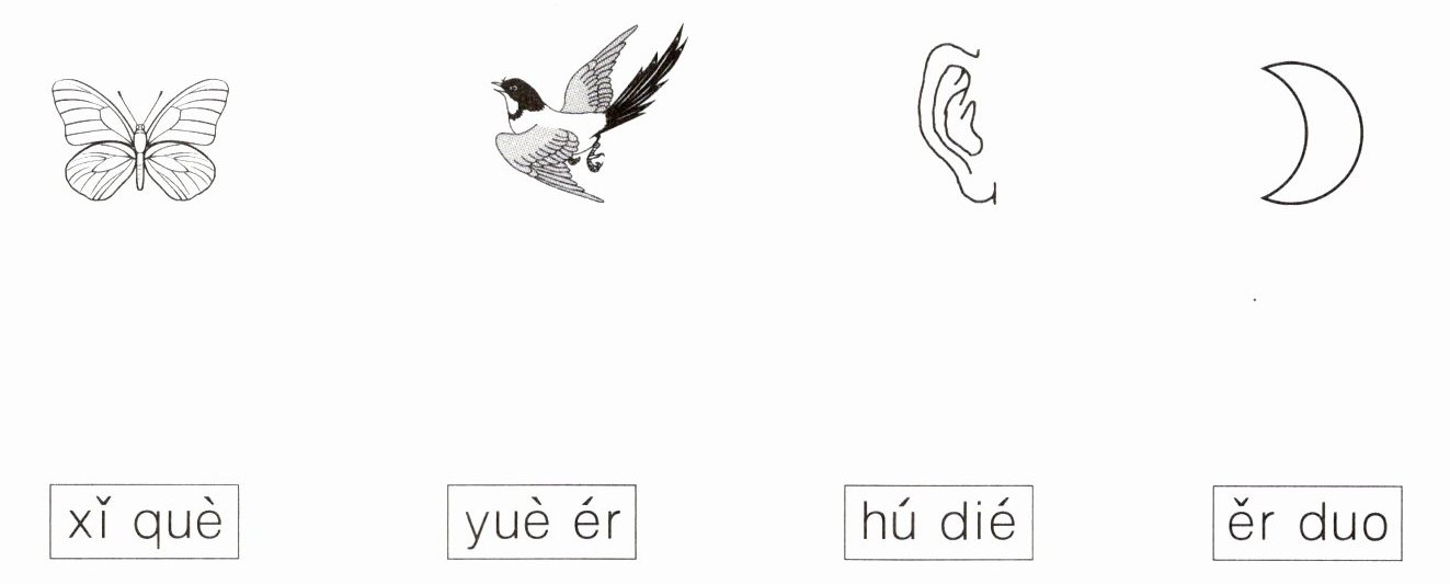第一张图片连 hú dié,第二张图片连 xǐ què,第三张图片连 ěr duo,第四张图片连 yuè ér。
