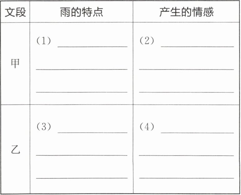1. 甲、乙两文描写的都是春天的雨,请分别概括文段中雨的特点以及因雨而产生的情感。