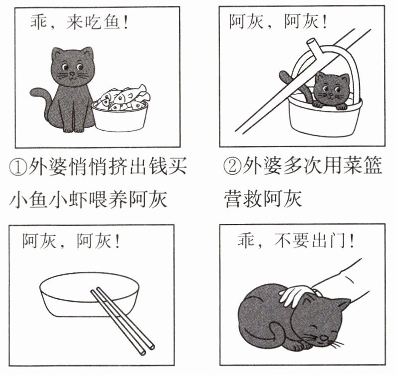 1. ③外婆敲饭盆走街串巷寻找阿灰 ④外婆温情地抚摸劝导丢失的阿灰 2. 第一次对阿灰的呼唤是阿灰在屋檐不敢返回,为鼓励阿灰给它信心,让它有勇气跳到篮子里,此时的呼唤蕴含着温柔的鼓励。第二次对阿灰的呼唤是外婆为了寻找失踪的阿灰而走家串户地呼唤它,此时外婆对阿灰的呼唤蕴含着她对阿灰的担忧、焦虑和忧伤。 3. (1)这句话运用比喻的修辞手法,把阿灰比作一位“智者”,生动形象地写出它面对老鼠肆意横行时,淡然自若的情态,写出了它惬意洒脱。 (2)这句话运用动作描写,把外婆不顾劝阻走家串户寻找到阿灰后温柔抚摸、轻声劝说阿灰的动作细腻地展现出来,体现了外婆对阿灰的怜爱。 4. [示例] 我赞成此文作为《猫》的拓展篇目。《猫》叙述了“我”家三次养猫的经历,详写了第三只猫,它丑陋而慵懒,因主人的偏见而被扼杀。本文中的阿灰也同样慵懒,却得到外婆的格外照料与关爱,自在惬意,任性洒脱。两篇文章都写了人和猫相处的事件,故这篇文章适合作为课文《猫》的拓展篇目。(或:两只猫完全不同的命运,折射出人性的弱点与美好。人的情感可以蒙蔽双眼,人也可以无私地爱动物,建立一段超越时空的美好感情。两者的主题相似,所以可以进行对比阅读。)