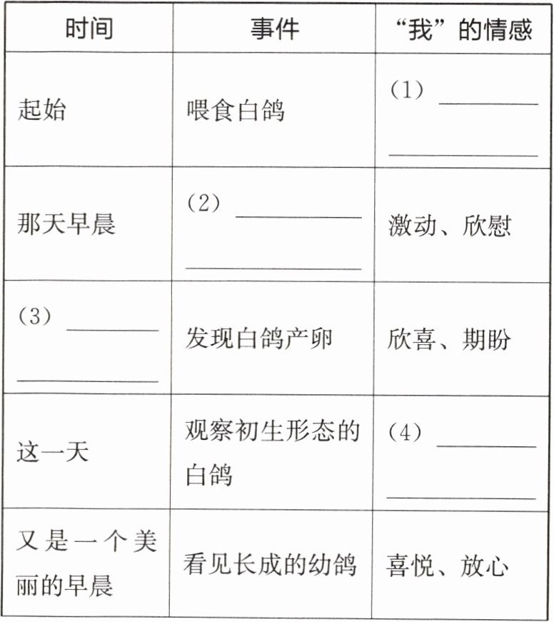 |(3)______|发现白鸽产卵|欣喜、期盼|