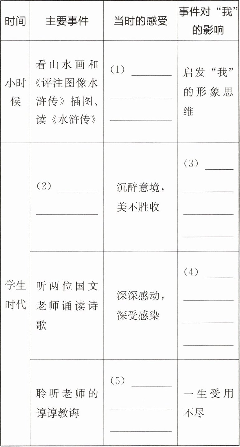 |小时候|看山水画和《评注图像水浒传》插图、读《水浒传》|(1)______|启发“我”的形象思维|