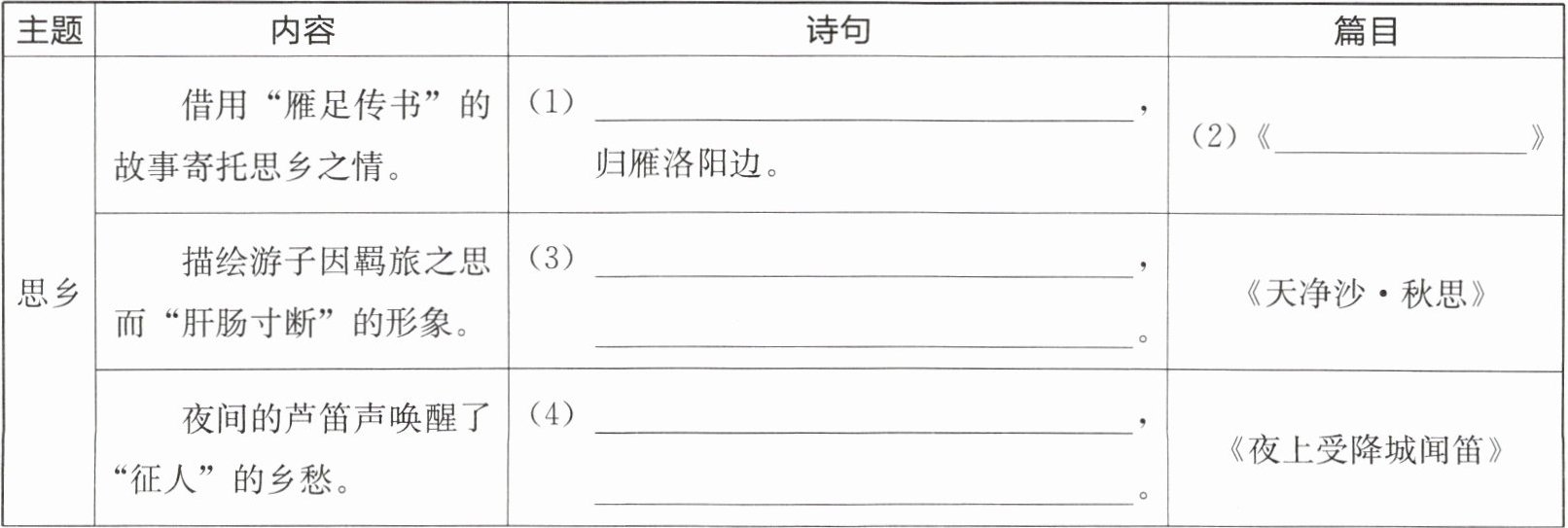 |思乡|借用“雁足传书”的故事寄托思乡之情。|(1)______,归雁洛阳边。|(2)《______》|