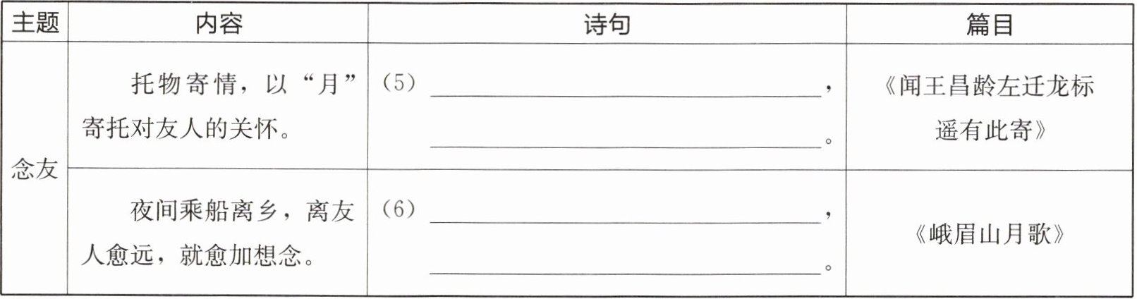 |念友|托物寄情,以“月”寄托对友人的关怀。|(5)______,______。|《闻王昌龄左迁龙标遥有此寄》|