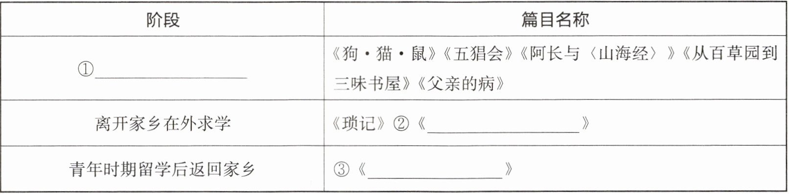 |①______|《狗·猫·鼠》《五猖会》《阿长与〈山海经〉》《从百草园到三味书屋》《父亲的病》|