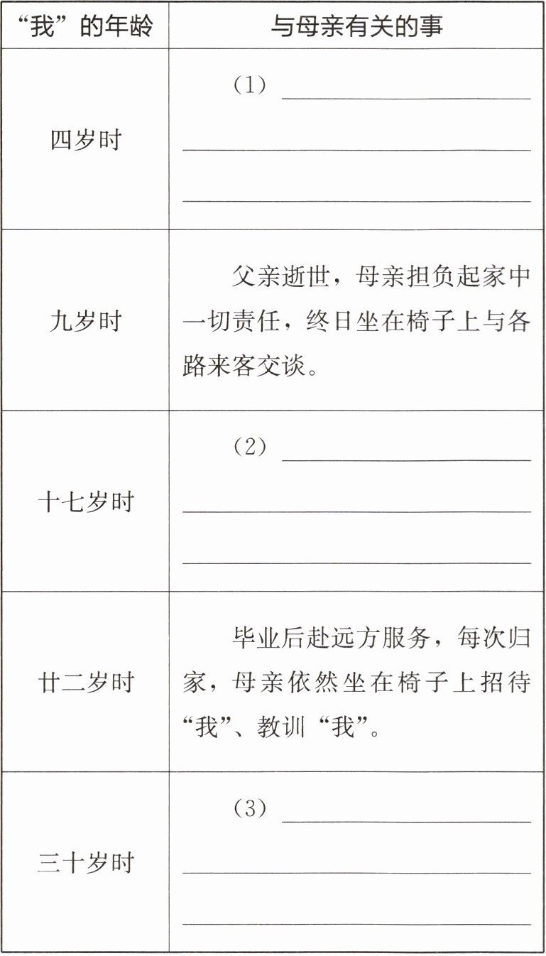 1. (1)父亲因祖母逝世郁郁不乐,不管家事,科举废止后更是母亲兼理家事和店事。 (2)“我”到远方求学,每次临行时和放假归来时,母亲都给予“我”关照和勉励、教训或责备。 (3)“我”弃职归家,母亲已一头银发,但仍每天坐在那把椅子上,严肃慈祥。 2. 朗读设计:我家老屋西北角里的八仙椅子上,从此/不再/有我母亲坐着了。朗读时应放缓语速,重读“不再”一词,用悲痛的心情诵读。 理由:这句话表达了“我”因母亲逝世而悲伤的心情,因此诵读时语速要慢,代入情感,突出“不再”。 3. ①本文以“我”的成长为线索,推动文章情节向纵深发展;②“我”始终是所有事件的亲历者,使文中关于母亲的故事更具真实性,叙述更亲切自然;③以第一人称“我”的口吻娓娓道来,拉近了“我”与读者之间的距离,容易引发读者共鸣。 4. 同:都表现出母亲为家庭的默默付出和对子女真挚无私的爱,赞扬了母亲的平凡与伟大,表达了对母亲深深的怀念。异:本文表达了对母亲在自己成长过程中对自己的训诲与勉励的感激之情;《回忆我的母亲》则表达了对母亲对自己的潜移默化的教导的感谢之情,以及未能再见母亲一面的遗憾与哀痛之情。