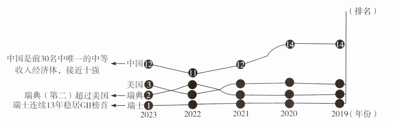 1.2019 年到 2023 年,在全球创新指数排名中,中国作为前 30 名中唯一的中等收入经济体,排名分别为 14 名、14 名、12 名、11 名、12 名,整体呈上升趋势,其中 2022 年排名最靠前,接近十强。 2.①概括性强。②简洁明了。③醒目亮眼。 3.[示例]①中国在多个领域实现了科技创新,为全球发展增添新活力、注入新动能。②作为中等收入经济体,近年来不断刷新全球创新指数排名,接近十强。③大力发展新质生产力,点燃了全球发展新引擎。