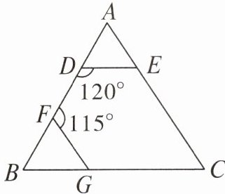 3. 如图,在△ABC中,若DE//BC,FG//AC,∠BDE= 120°,∠DFG= 115°,则∠C=