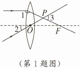 1. 如图,一束平行于主光轴OF的光线经凸透镜折射后,其折射光线与一束经过光心O的光线相交于点P,点F为焦点。若∠1 = 155°,∠2 = 30°,则∠3为(