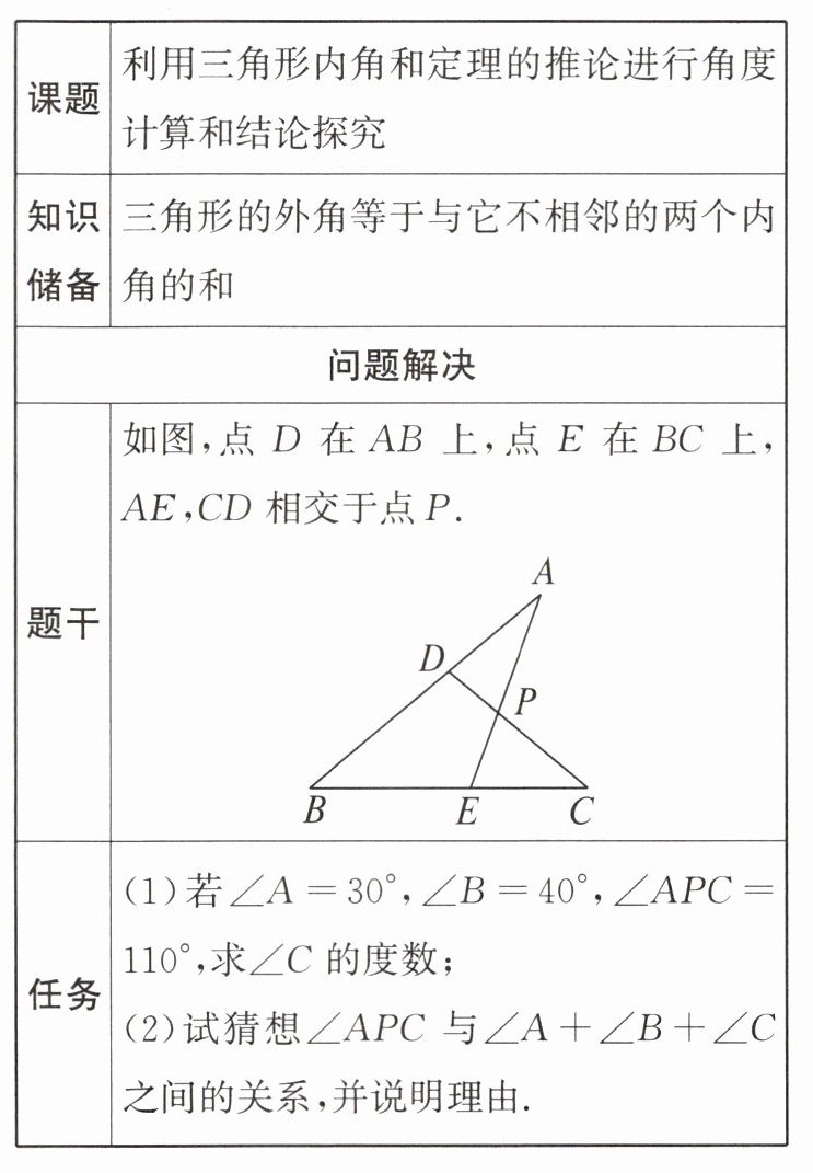 7. 某小组利用活动课进行三角形外角知识的相关课题研究,制定的项目式学习表如下,请你解答任务中的问题。