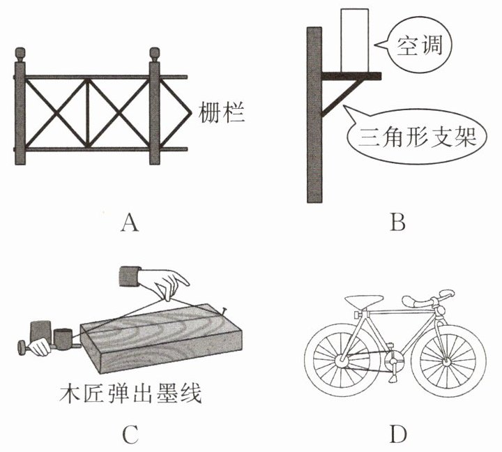 【解析】选项 A,B,D 中均利用了三角形的稳定性,选项 C 中利用的原理是两点确定一条直线.