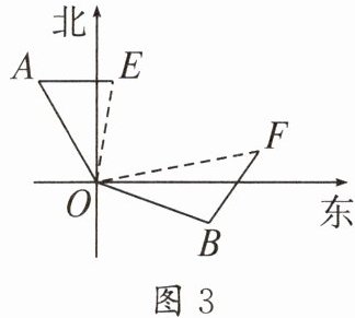 如图3,在某次军事演习中,舰艇甲在指挥中心(O处)北偏西30°的A处,舰艇乙在指挥中心南偏东70°的B处,并且两舰艇到指挥中心的距离相等. 接到行动指令后,舰艇甲向正东方向以60海里/时的速度前进,舰艇乙沿北偏东50°的方向以80海里/时的速度前进,1.5小时后,指挥中心观测到甲、乙两舰艇分别到达E,F处,且两舰艇之间夹角∠EOF为70°,试求此时两舰艇之间的距离.