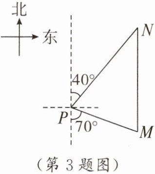 3. 如图,一艘海轮位于灯塔 P 的南偏东 70°方向的 M 处,它以每小时 45 海里的速度向正北方向航行,2 小时后到达位于灯塔 P 的北偏东 40°的 N 处,则 N 处与灯塔 P 的距离为