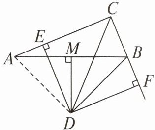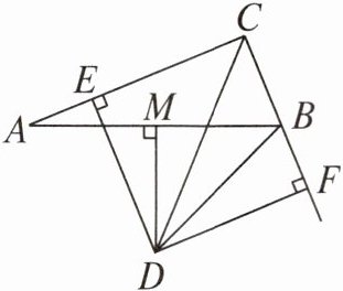 【典型例题 2】如图,在 $ \triangle ABC $ 中,$ \angle ACB $ 的平分线与 $ AB $ 的垂直平分线 $ DM $ 交于点 $ D $,$ DE \perp AC $ 于点 $ E $,$ DF \perp BC $ 交 $ CB $ 的延长线于点 $ F $。
