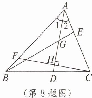 8. 如图,在 $\triangle ABC$ 中,$\angle 1 = \angle 2$,$G$ 是 $AD$ 的中点,延长 $BG$ 交 $AC$ 于点 $E$,$F$ 为 $AB$ 上一点,$CF\perp AD$ 交 $AD$ 于点 $H$。①$AD$ 是 $\triangle ABE$ 的角平分线;②$BE$ 是 $\triangle ABD$ 的边 $AD$ 上的中线;③$CH$ 为 $\triangle ACD$ 的边 $AD$ 上的高;④$AH$ 是 $\triangle ACF$ 的角平分线和高线。上述说法正确的有